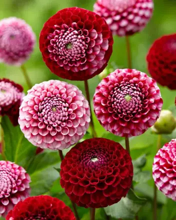 Pomponkové jiřiny vytvářejí drobné, perfektně kulovité květy složené z krátkých, pravidelně stáčených okvětních lístků. Jsou extrémně odolné vůči větru i dešti, dlouho vydrží ve váze a díky kompaktním květům působí velmi čistě a dekorativně. Patří k nejoblíbenějším skupinám jiřin pro dlouhé a nepřetržité kvetení.